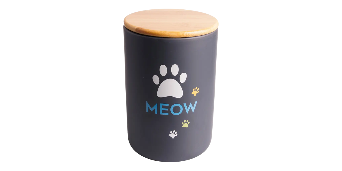 Керамическая банка Mr. Kranch Meow – стильный и удобный способ хранить сухой корм, чтобы он не выветривался и не терял свежесть. А еще не придется оставлять большие пакеты, если вы привыкли закупать питание в больших порциях.